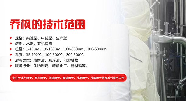 上海喬楓實業有限公司,成立于2012年,是從事噴霧干燥設備的研發設計、生產、銷售(小型噴霧干燥機實驗型噴霧干燥機,35℃低溫噴霧干燥機,有機溶劑噴霧干燥機低溫閉式循環噴霧干燥機、超細粉末噴霧干燥機、噴霧冷凍干燥機、真空噴霧干燥機、氣流噴霧干燥機,噴霧造粒干燥機,離心噴霧干燥機沸騰制粒機等)和售后于一體的綜合性公司,本公司現成為一家致力于為生物制藥、精細化工、新能源、陶瓷造粒及食品工程等領域提供全套解決方案的整線交鑰匙工程企業。